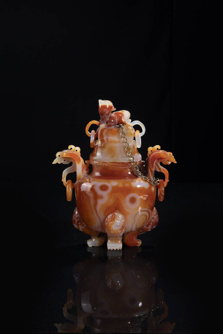 Vaso in agata con manici e coperchio sormontato da animale Cina Repubblica XX [..]