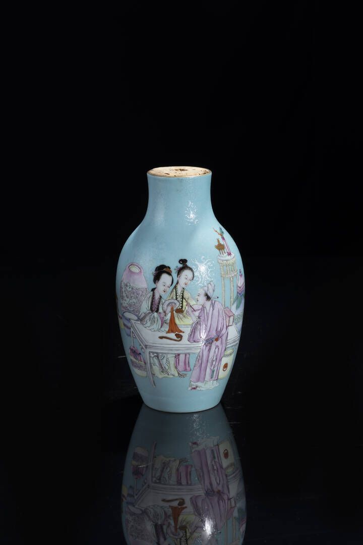 Vaso in porcellana Famiglia Rosa con decori di personaggi su fondo turchese Cina Repubblica XX sec H cm 21 Diam cm 11