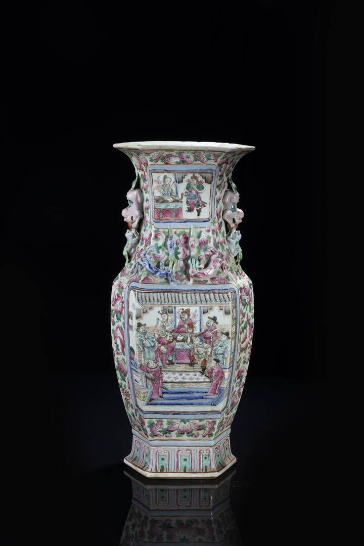 Vaso in porcellana Famiglia Rosa dipinto con scene di corte entro riserve e draghi [..]
