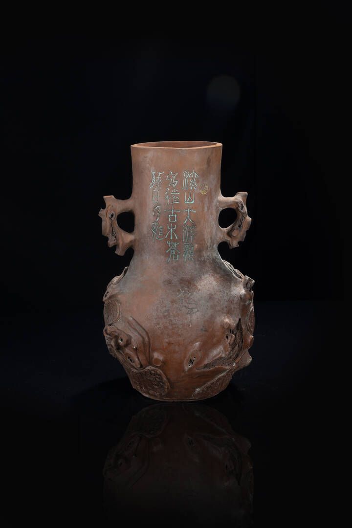 Vaso in terracotta con decori vegetali e iscrizioni Cina Repubblica XX sec H [..]