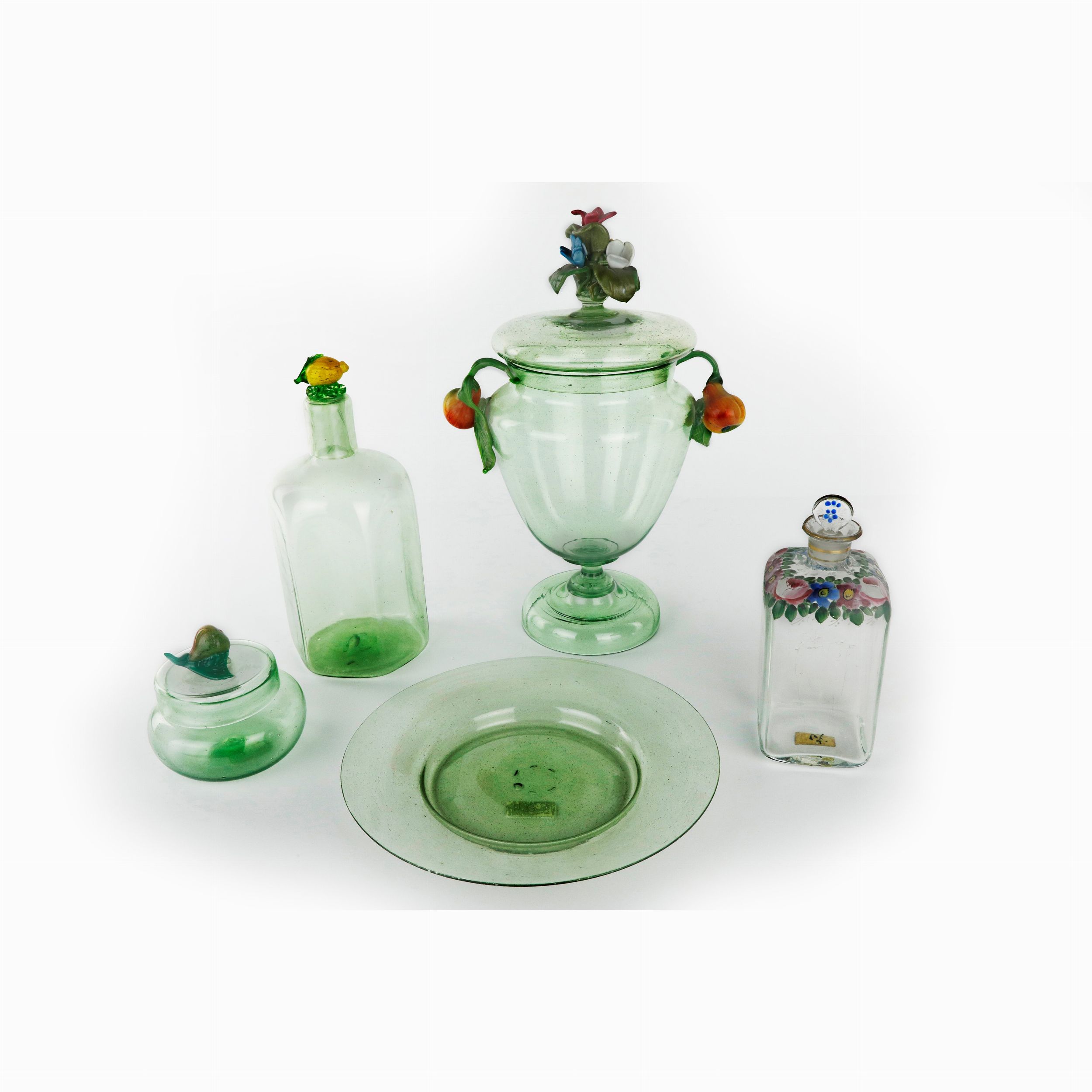 Lotto di 4 recipienti ed 1 piatto in vetro