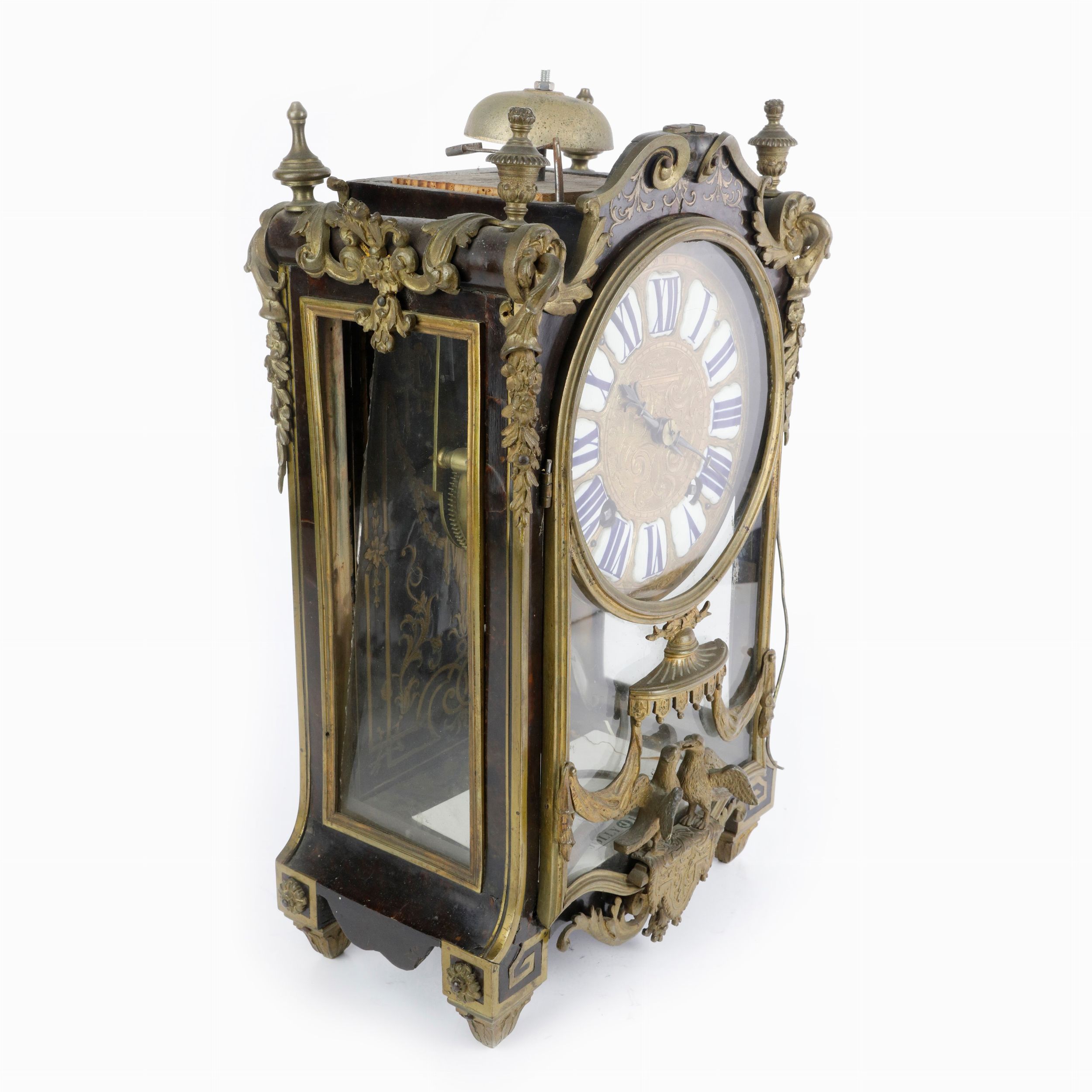 XVIII secolo meccanismo a pendolo entro cassa in legno ebanizzato con finiture in bronzo, quadrante in bronzo con numeri romani smaltati, piccole mancanze