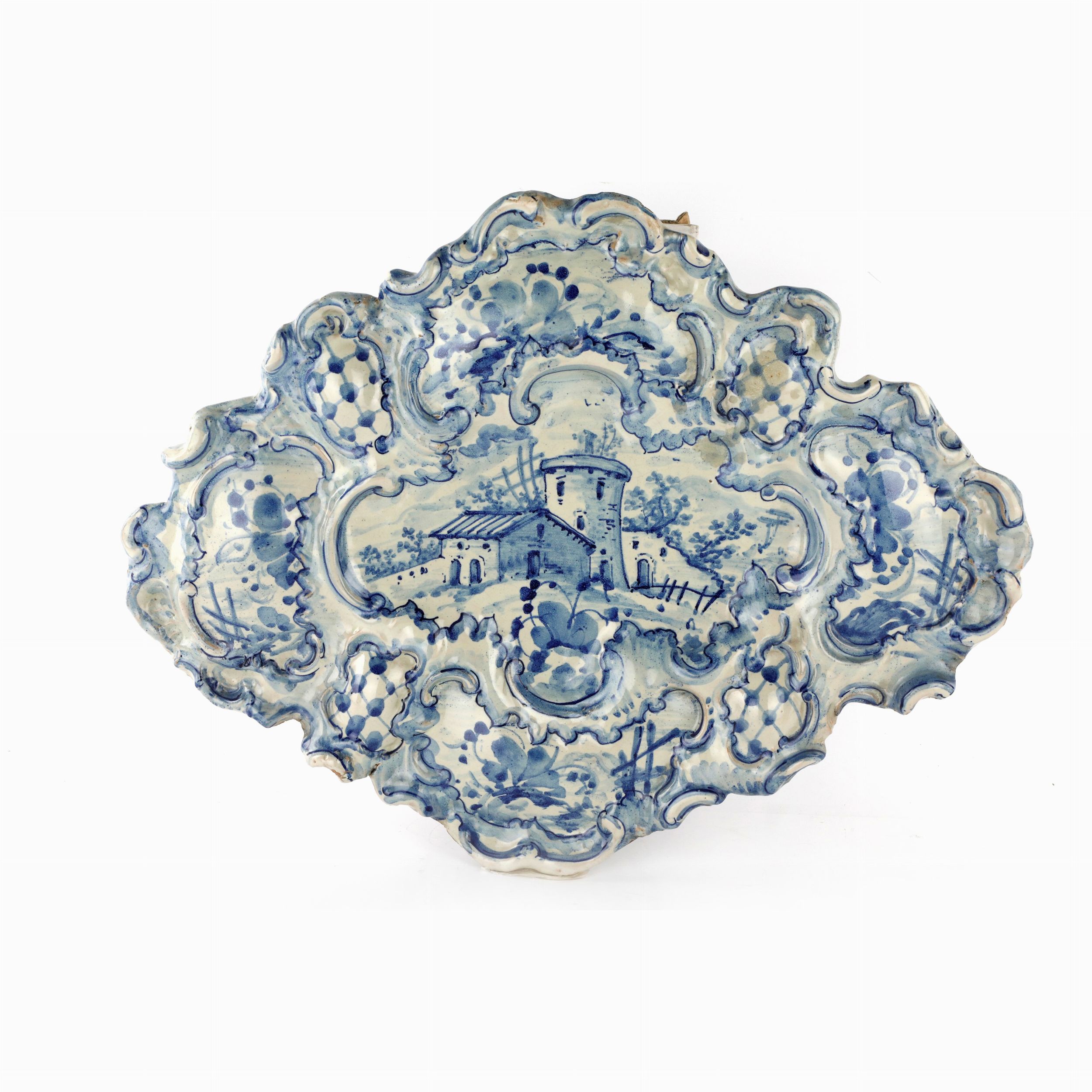 inizio XX secolo di forma ovale di linea centinata all'orlo, con decoro a scena di paesaggio con torre e casa al centro del fondo, bianca e blue. produzione ligure