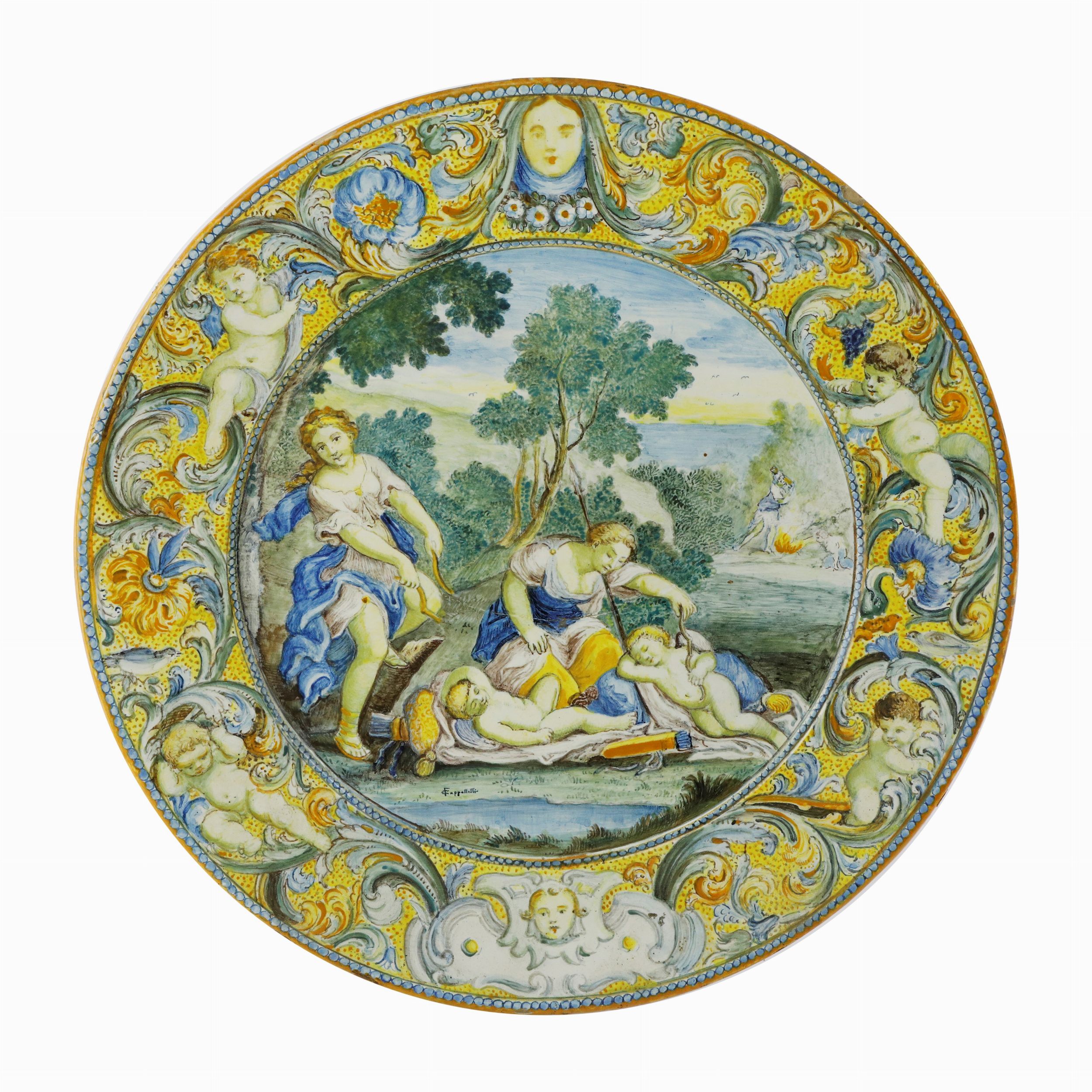 seconda metà XIX secolo con decoro sulla tesa a girali e putti festanti, bordo in arancione e fondo del piatto con scena bucolica con Diana e putti. Firmato sul fronte in basso a sinistra. Difetto di cottura al centro del piatto