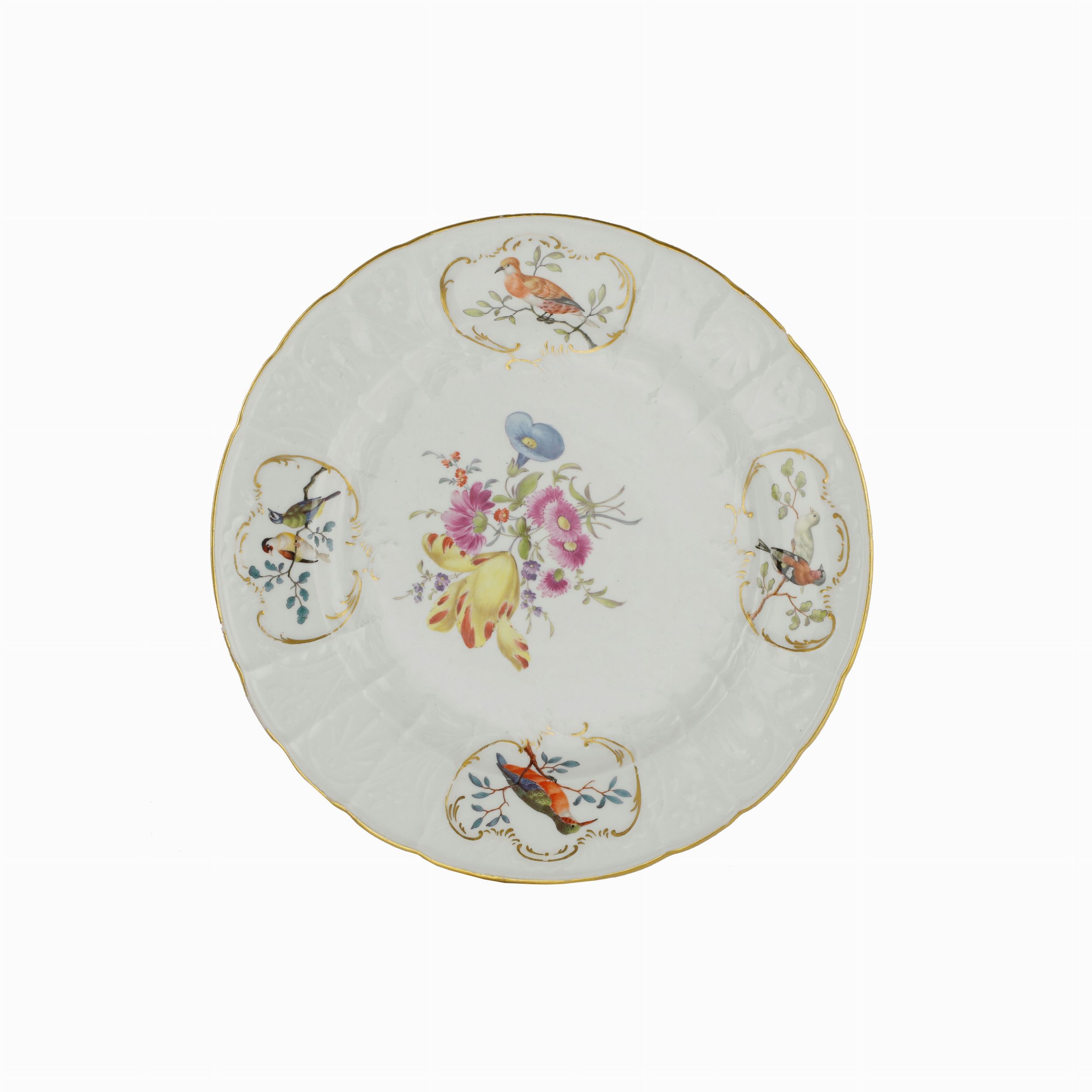 24,5 x 3 x 14 cm terzo quarto XVIII secolo da coltello, tesa a rilievo a motivi floreali entro costoloni, base d'appoggio ad anello. Decoro con uccelli entro riserve dorate lungo la tesa e mazzo di fiori sul fondo del piatto, finiture in oro zecchino lungo il bordo. Marchio spade incrociate con punto tra le else in blu sottosmalto, manifattura di Meissen. Dorature in più punti usurate