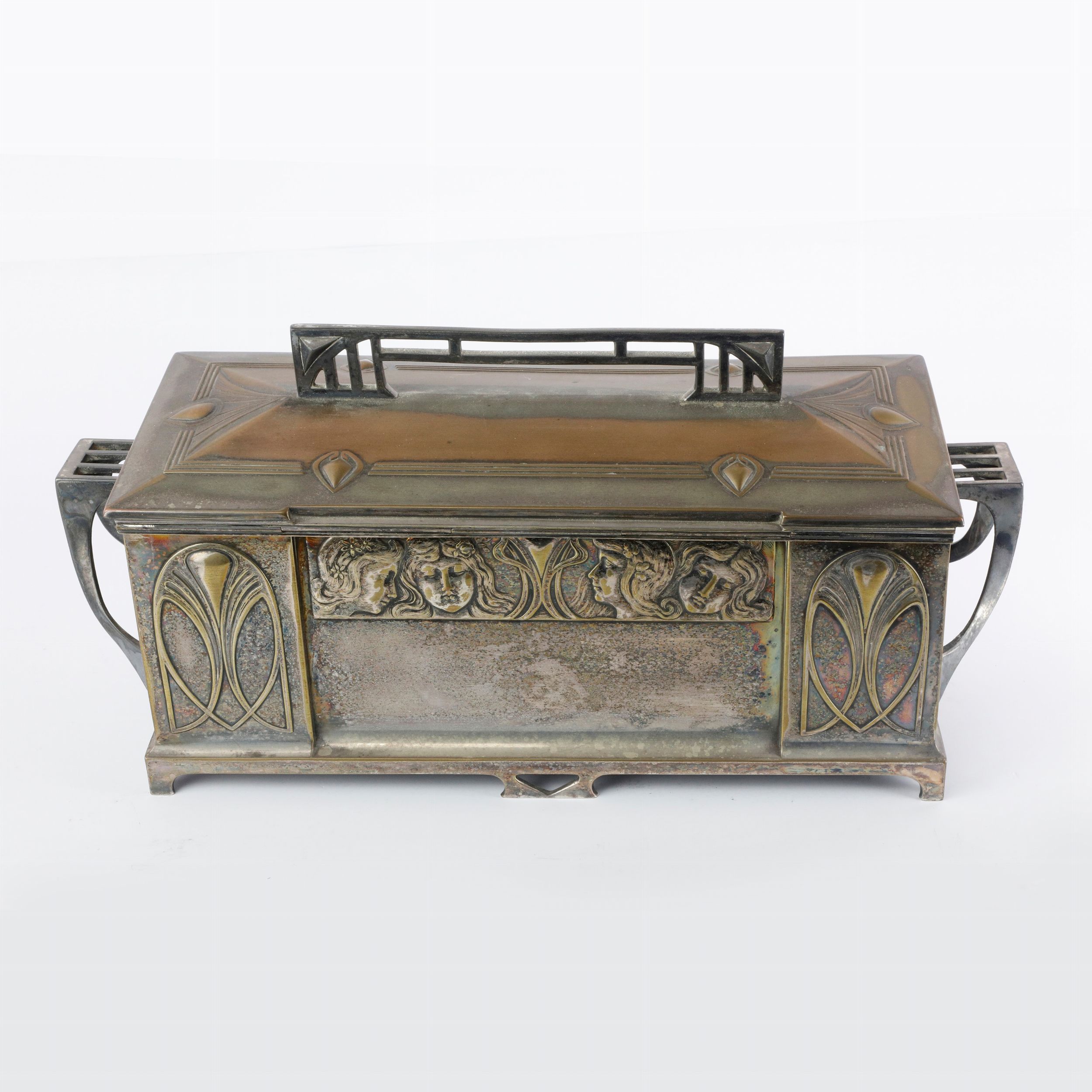 inizi XX secolo con decoro a rilievo a motivi floreali e teste di fanciulle, parti usurate e difettose., senza chiave.