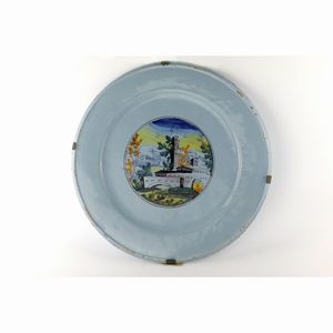 diametro 25,5 x 2,5 x 15 cm fine XVIII inizio XIX secolo a fondo bianco con scena di paesaggio sul fondo,  [..]