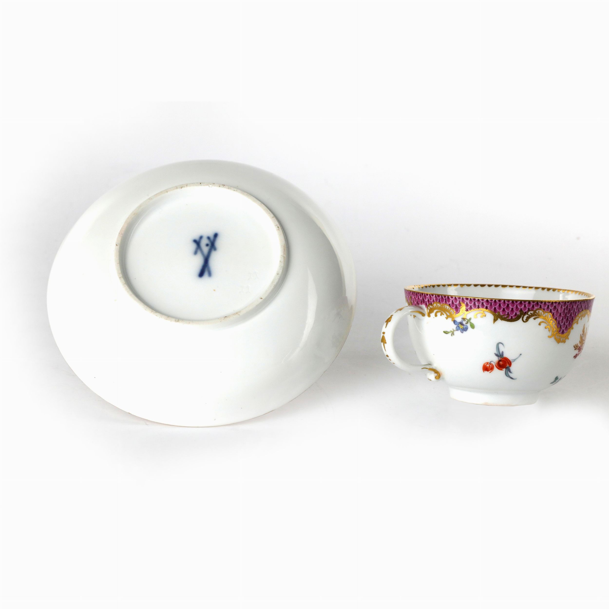 4 x 3 tazza e 12 x 3,5 x 6 cm piatto terzo quarto XVIII secolo tazza con ansa ad orecchio e piede ad anello alla base ;piatto en suite ad alto bordo con appoggio ad anello. Decorazione della tazza e del piatto a graticcio in porpora con finitura in oro zecchino lungo i bordi. Fondo e corpo della tazza con decorazione policroma ad uccelli e fiori. Fondo del piatto a decoro policromo di uccelli e fiorellini. Marchio spade incrociate con punto all'incrocio delle else sottosmalto .Manifattura di Meissen