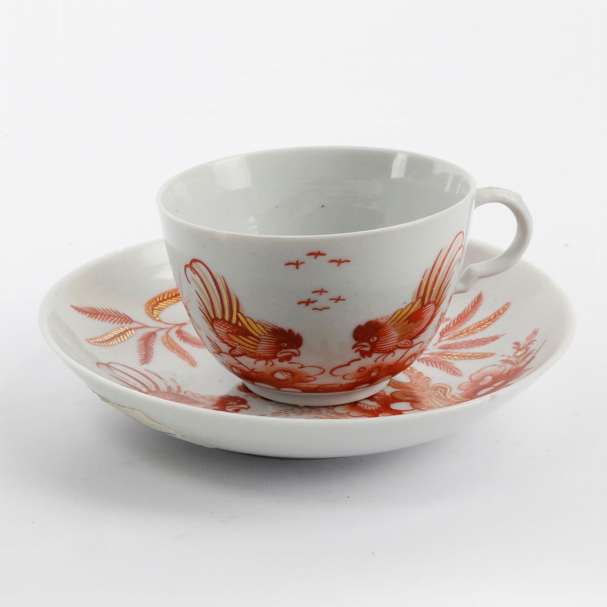 seconda metà XVIII secolo in pasta bianca con decoro a coda di gallo in porpora e oro. Piccole sbeccature e mancanze lungo il bordo della tazza e del piatto. Manifattura Ginori
