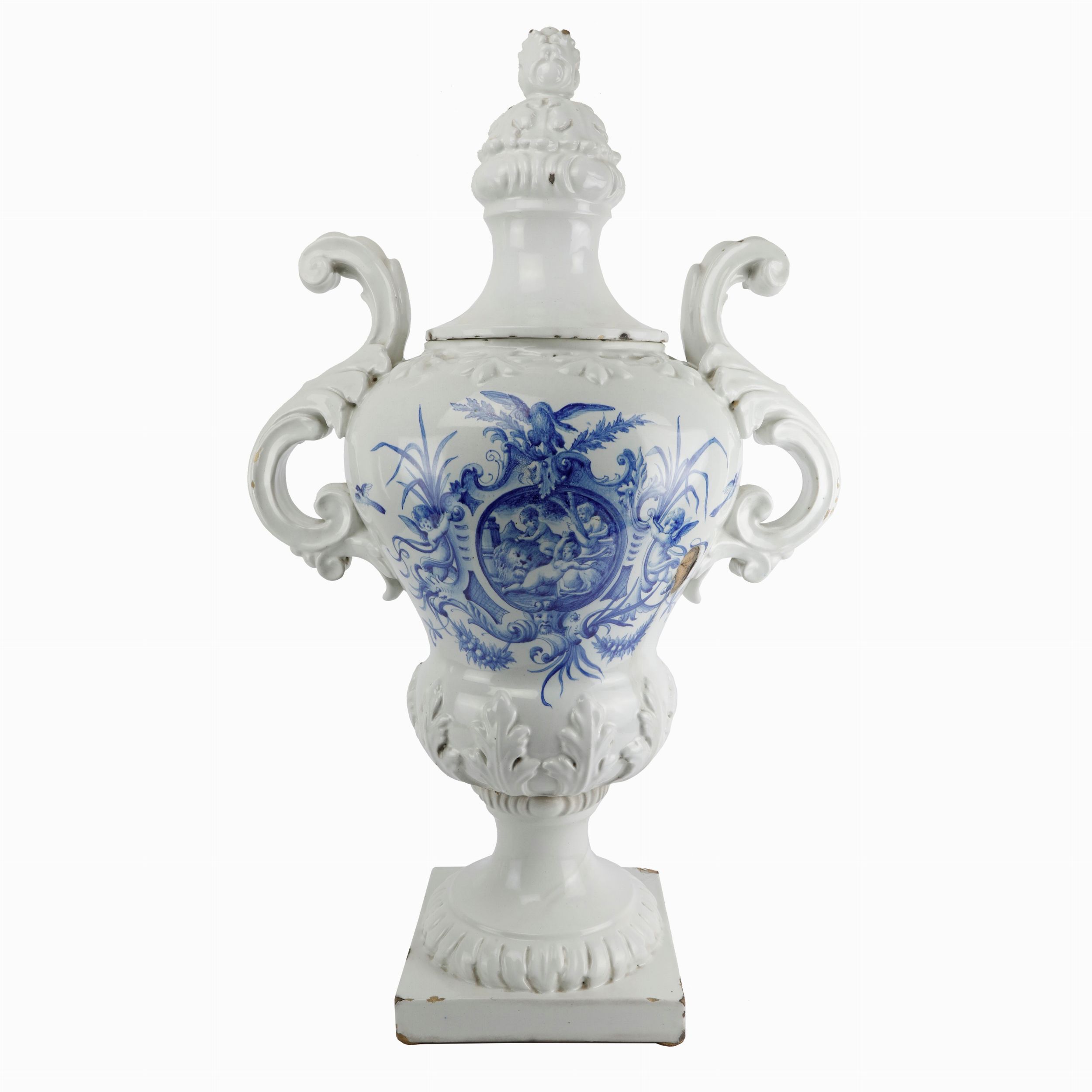 80 x 54 cm ultimo quarto XIX secolo con decoro floreale e putti entro riserve in blu cobalto, anse a foggia, coperchio con impugnatura a bocciolo, piede a quadrangolare. Sbeccatura alla base lungo il bordo del coperchio ed 1 mancanza sul corpo. Manifattura Cantagalli