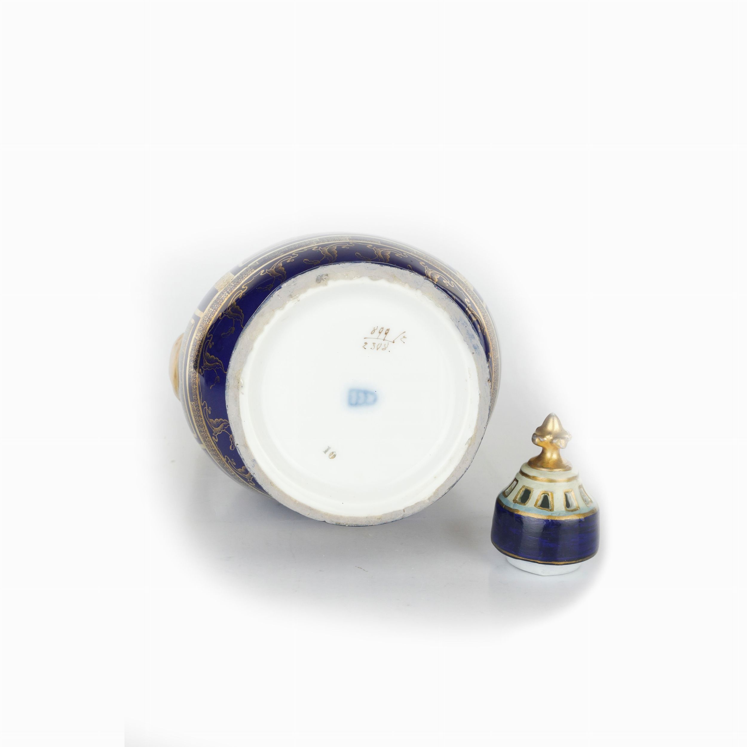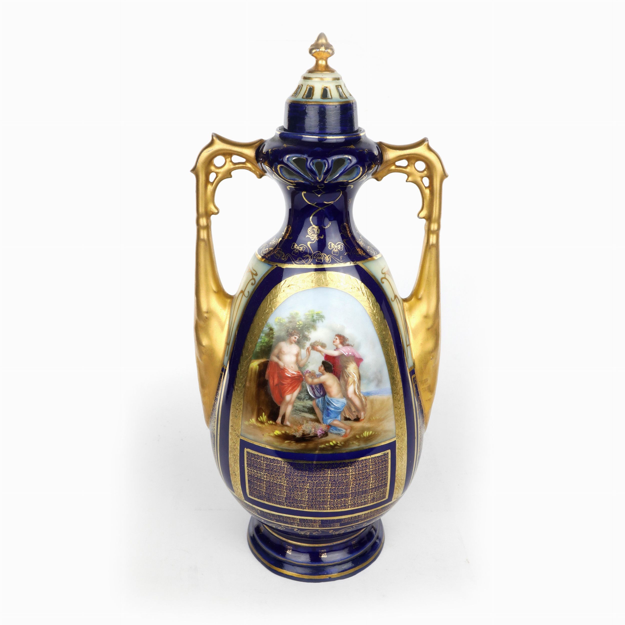 prima metà XX in porcellana policroma a fondo blue con scena tratto dal repertorio classico al verso, finiture in oro zecchino. Manifattura di Vienna