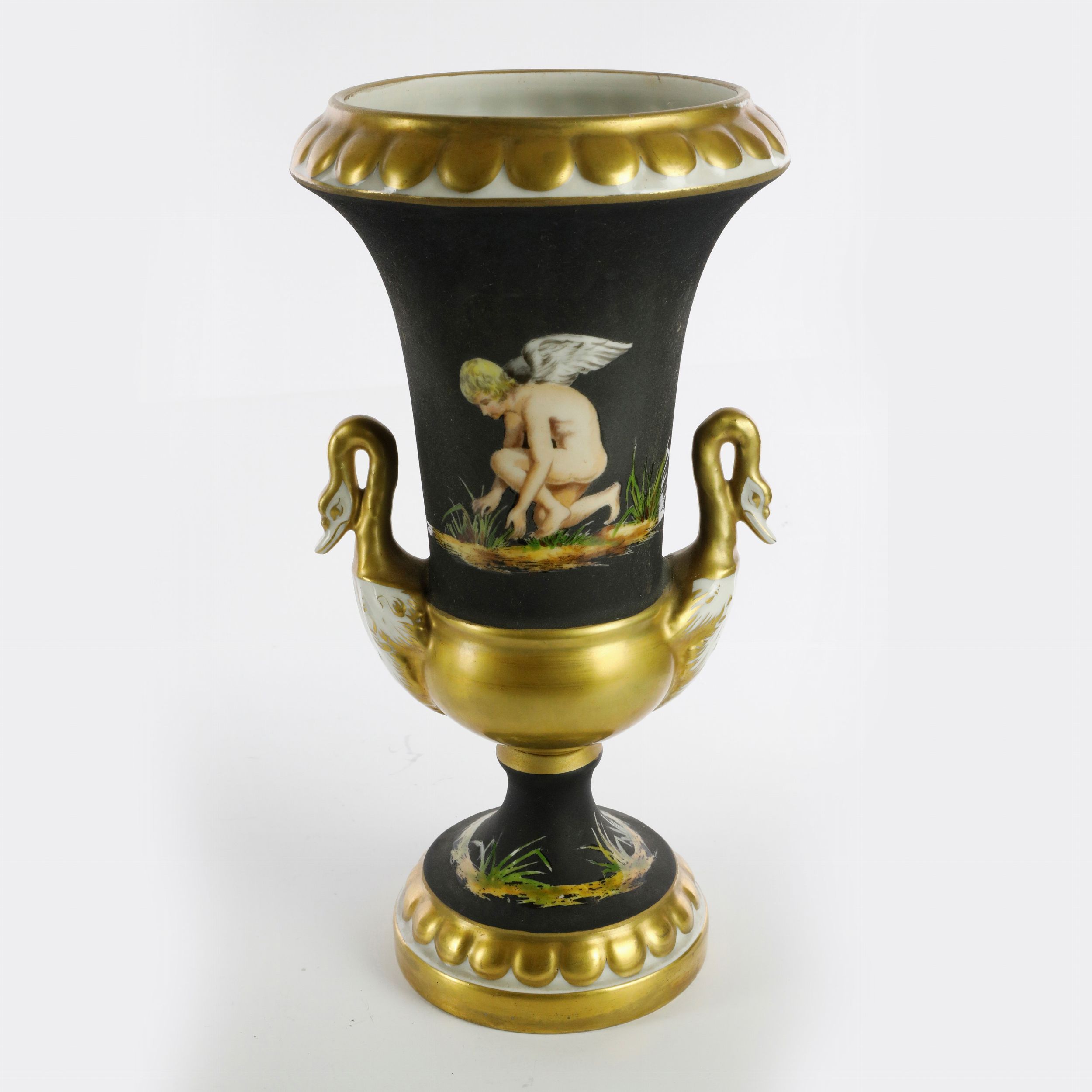 29 x 10,5 cm metà XX secolo a 2 corpi a forma di calice con anse a forma di cigno e orlo superiore ed inferiore alla base ad ovuli. Decoro con angelo alato farfalle e verdura in policromia su fondo nero finiture in oro zecchino. Manifattura francese con marchio in blu sottosmalto alla base.