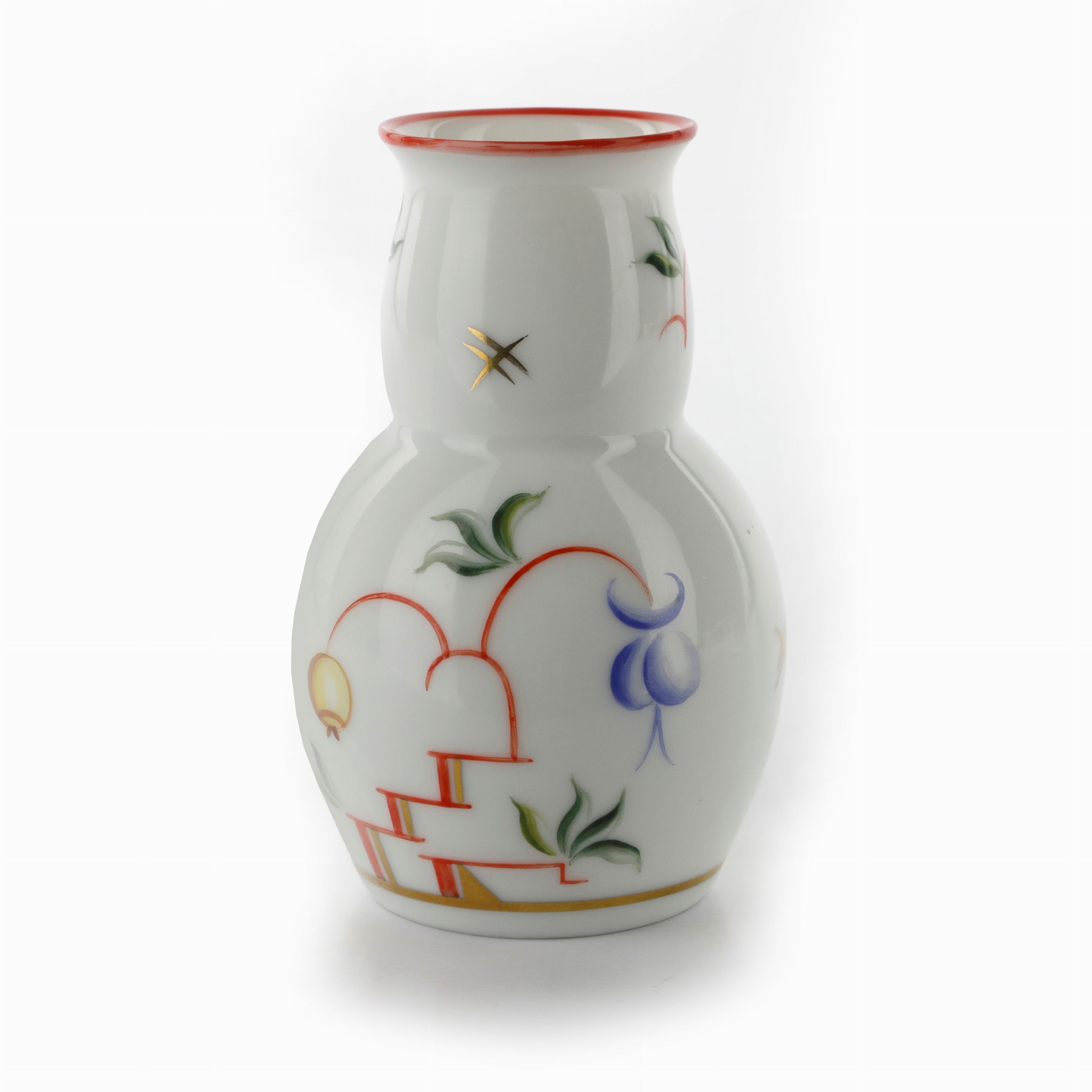 9 x 3,5 cm anni '20-'30 decoro a fiori con elementi geometrici stilizzati, finiture in oro zecchino. Forma a balaustro con fondo leggermente ribassato, manifattura di Augarten. Marchio della manifattura in rosso e blu con numeri di serie sottosmalto alla base.