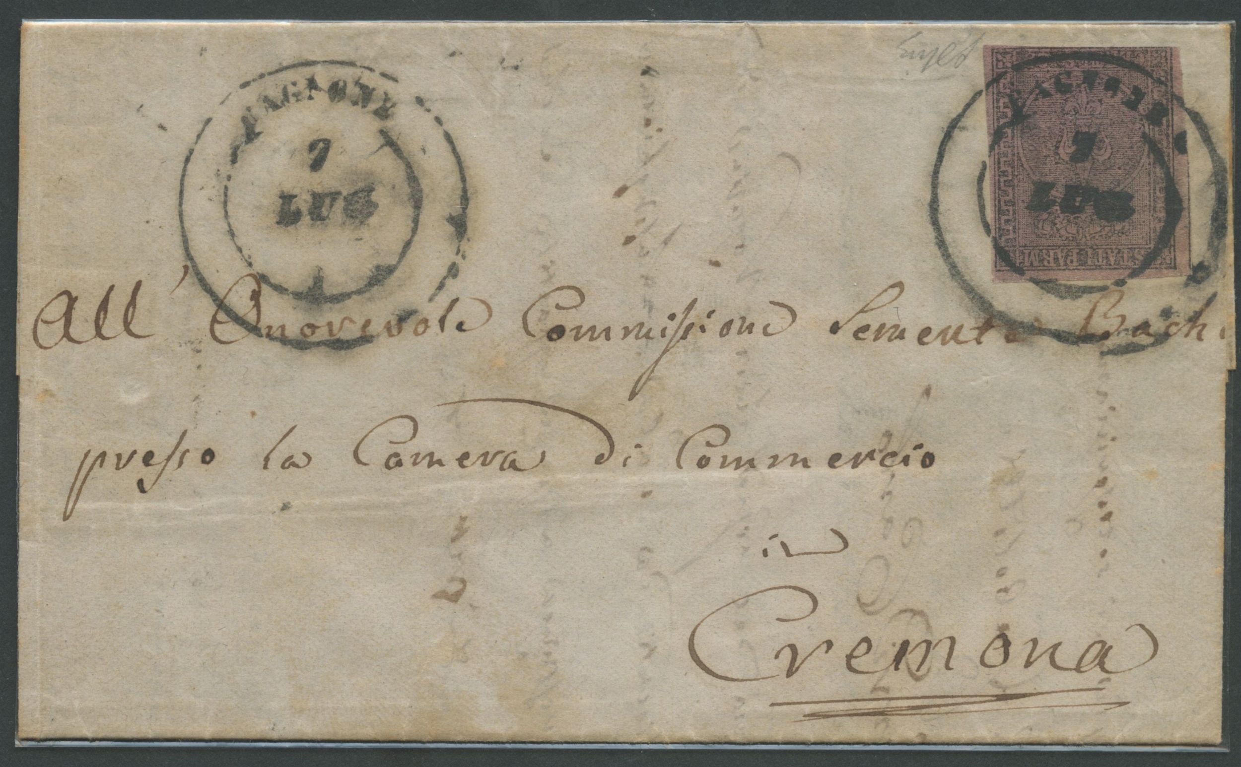 5.7.1859 - lettera da Bagnone per Cremona in periodo di II° Governo provvisorio, affrancata tramite un 25c. Violetto N.4. Sull'affrancatura il Doppio cerchio grande di Bagnone(11pt.) (A-) (Oliva)