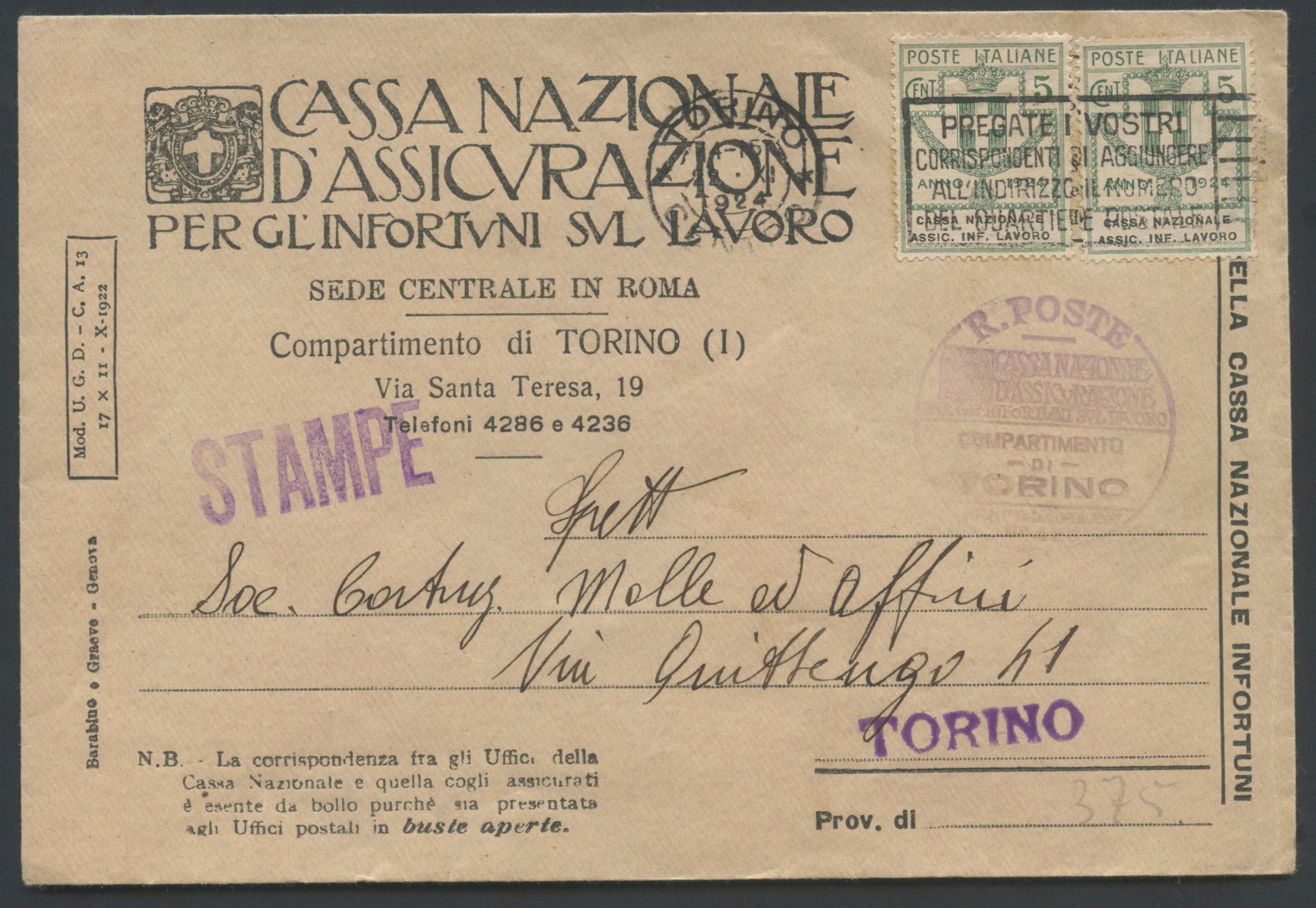 22.11.1924 Busta affrancata per 10 cent. tramite due valori da 5 cent. della cassa nazionale assic inf. lavoro da Torino per Città.