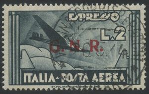 1944 - 2 Lire Ardesia n.125 (Espresso n.73) con soprastampa G.N.R. tiratura di Verona, usato con l'annullo [..]