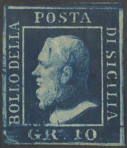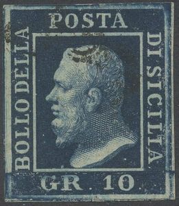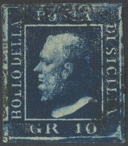 1859 - 10 gr. indaco n.12b ''Tiratura Antica'' usato con un annullamento leggerissimo e margini molto grandi. [..]