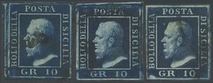 1859 - 10gr. tre esemplari di qualità straordinaria e firmati da Alberto Diena. (A+) (Alberto Diena, Emilio D [..]