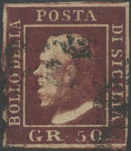 1859 - 50gr. n.14 usato. Tonalità di colore estremamente interessante. (A+) (cert. R. Diena)