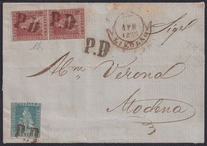 25.03.1855 - Busta da Livorno per Modena affrancata per 4 crazie tramite una coppia da 1cr. carminio chiaro + [..]