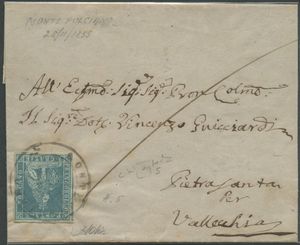 28.11.1855 - Lettera da Montepulciano per Pietrasanta affrancata tramite un 2cr. Azzurro Chiaro N.5. Sull'affrancatura [..]