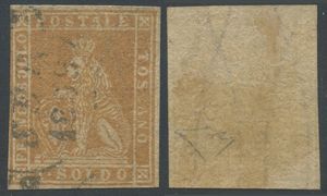 1857 - 1 soldo ocra n.11, filigrana linee ondulate, usato. (A) (Cert. Enzo Diena)