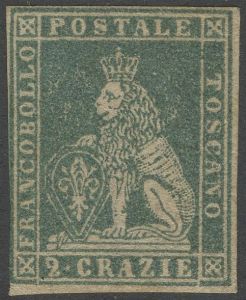 1857 - 2 cr. azzurro grigio verdastro n.13b, nuovo con gomma. A filo a sinistra, certificato come perfetto. (A-) [..]