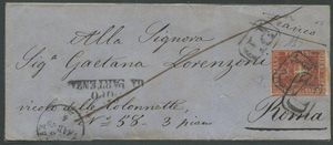 13.3.1860, Lettera da Firenze per Roma affrancata tramite un 40c. Carminio N.21. Tariffa di primo porto per la [..]