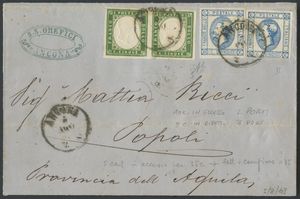 05.08.1863 - Lettera da Ancona per Popoli affrancata per 40 centesimi tramite una coppia del 5 cent. verde giallastro [..]