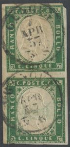 1857 - 5 cent. Verde Scuro n.13Ac in coppia verticale. La rara coppia è impreziosita da una stampa parassitaria [..]