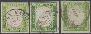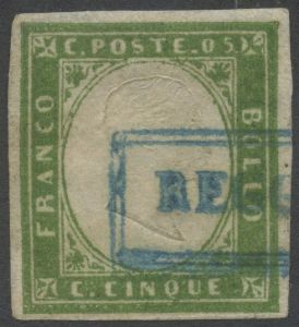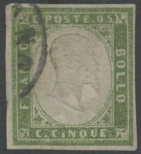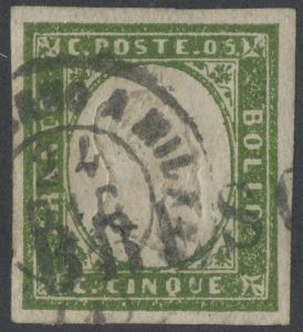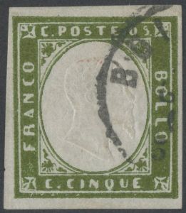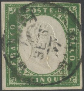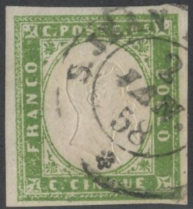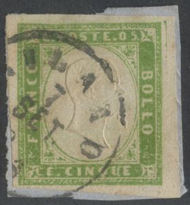 1857 - 5 cent. verde giallastro carico, tonalità classificata dal Rattone appartenente alla famiglia dei Verde [..]