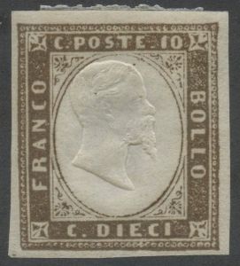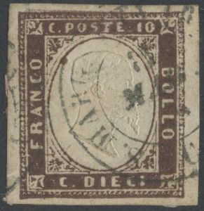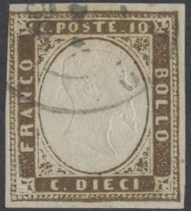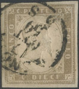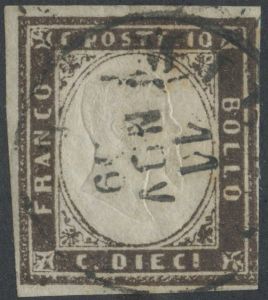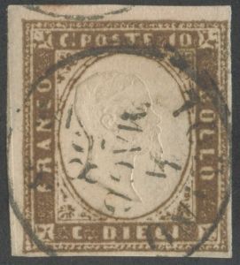 1859 - 10 cent. nella rara tonalità ''Cenere Grigio Seppia'' classificato dal sassone n.14Ad ed usato a Genova [..]