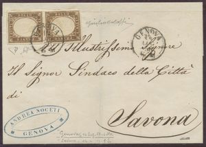 14.06.1858 Lettere da Genova per Savona affrancata per 20 centesimi tramite una coppia di 10 cent. Terra D'ombra [..]
