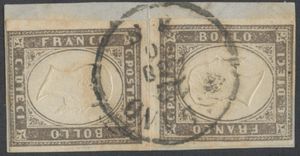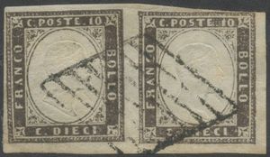 1859 - 10 cent. bruno grigiastro n.14A in versione scurissima in coppia usata tramite un annullo a griglia, l'esemplare [..]