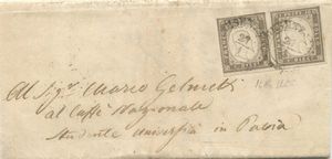 27.01.1860 - Lettera da Desenzano per Pavia affrancata per 20 centesimi tramite una coppia orizzontale del 10 [..]