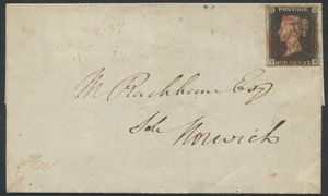 1840 - 1p. nero ''Penny Black'' n.1 isolato su busta. Certificato Bolaffi.