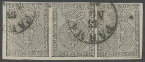 1852 - 10 cent. bianco n.2 in splendida striscia di tre. (LUX)
