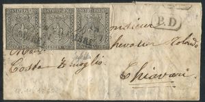 10.11.1855 - Lettera per Chiavari affrancata per 30 centesimi tramite una striscia di tre del 10 cent. bianco [..]