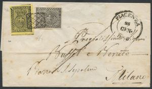25.01.1853 - Lettera da piacenza per Milano affrancata per 15 centesimi tramite un 5 cent. giallo n.1 con angolo [..]