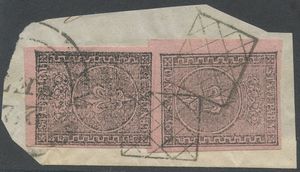 1852 - 15 cent. rosa n.3 due valori su frammento rispettivamente uno con angolo di foglio superiore destro e l'altro [..]