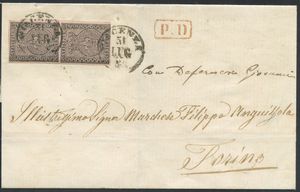 31.07.1856 - Lettera da Piacenza per Torino affrancata per 30 centesimi tramite una coppia di 15 cent. rosa n.3 [..]