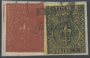 1853 - affrancatura mista I + II emissione composta da 5 cent. n.1 + 25 cent. senza la scritta ''cent 25'' non [..]