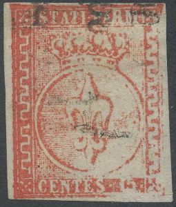 1857 - 15 cent. vermiglio n.10 con stampa povera e con greca larga a destra n.7c, usato. (A+)