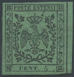 1852 - 5 cent. verde n.1 nuovo con gomma originale, linguellato. Bordo di foglio a destra. (A+) (cert. Sorani, [..]