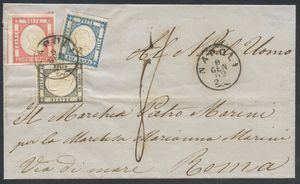 09.01.1862 - Lettera da Napoli per Roma affrancata per 8gr. tramite un'affrancatura tricolore 1gr.+2gr.+5gr. n.19,20,21. [..]