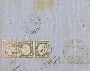 10.11.1855 - Lettera per Chiavari affrancata per 30 centesimi tramite una striscia di tre del 10 cent. bianco [..]
