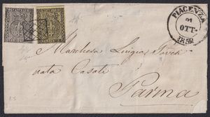 21.10.1852 - Busta da Piacenza per Parma affrancata per 15 centesimi tramite un 5 cent. giallo n.1 + 10 cent. [..]