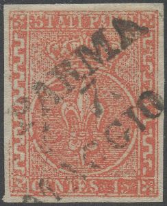 1857 - 15 cent. vermiglio n.10 con stampa povera e con greca larga a destra n.7c, usato. (A+)