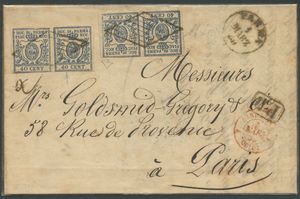 01.03.1859 - Lettera da Parma per Parigi affrancata con due coppie del 40c. Azzurro n.11, una di queste con accoppiamento [..]