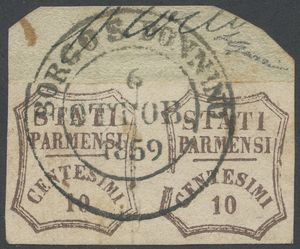 1859 - 10 cent. bruno n.14 in splendida coppia orizzontale usata il 6 ottobre 1859 a Borgo San Donnino. (Gazzi, [..]
